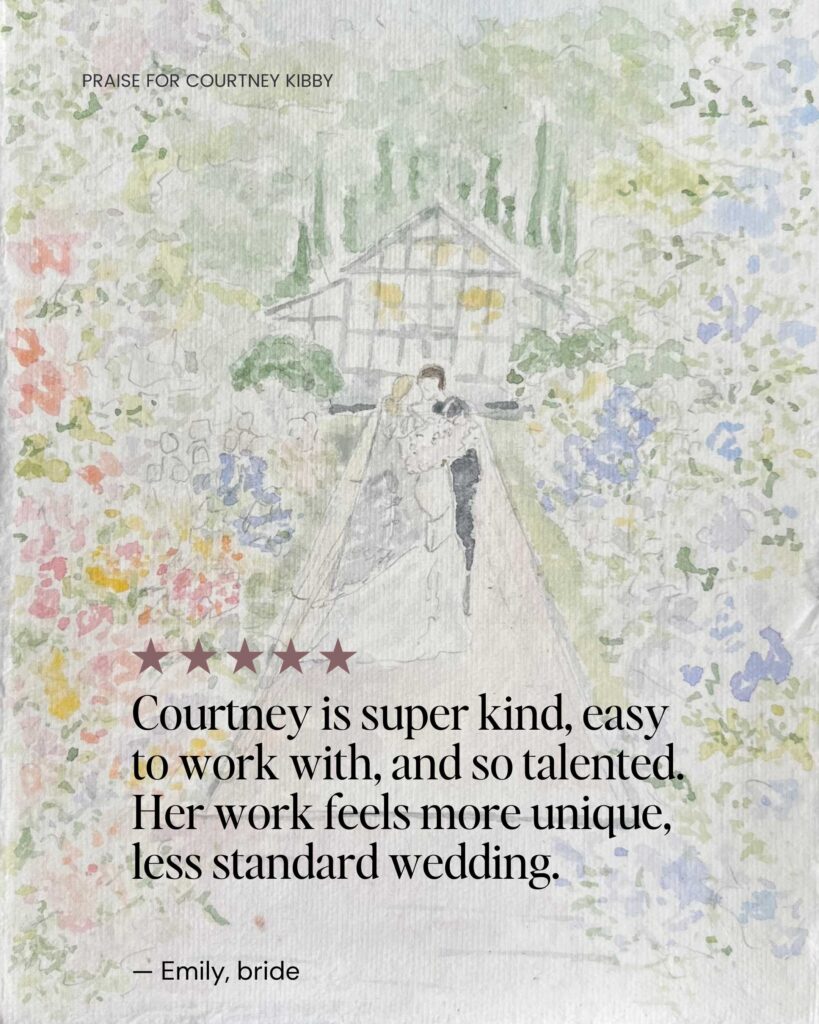 I’m Courtney Kibby, a fine artist specializing in live wedding painting, and I travel to France to paint weddings that feel like stories unfolding. My medium of choice is watercolor — soft, luminous, romantic — and my approach is grounded in hospitality, intention, and honoring what makes your day yours.